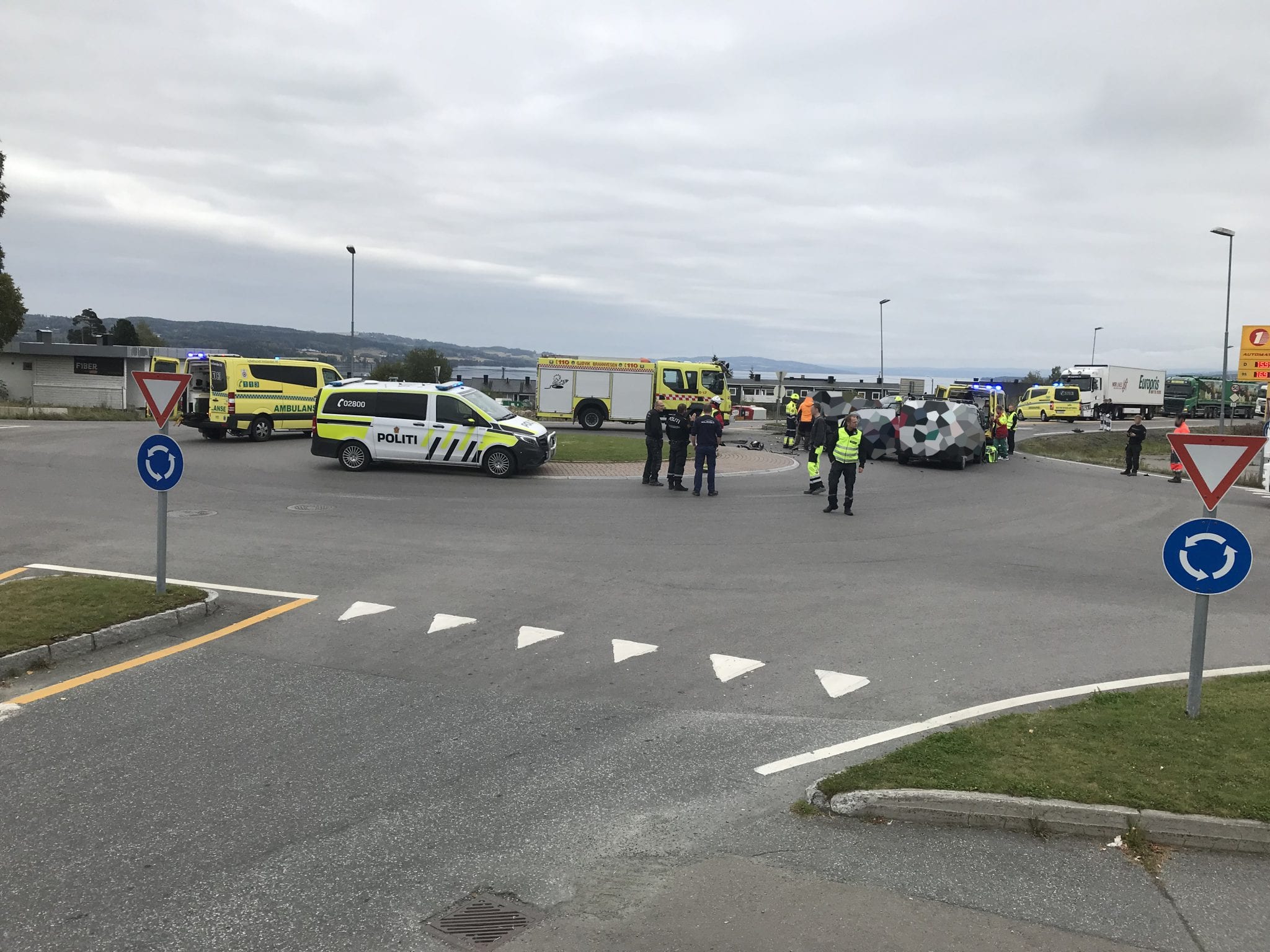 Tre biler var involvert i ulykken, én personbil og to varebiler. Klokka 12.45 var det store utfordringer med trafikken på stedet, og politiet varslet at vegene inn mot rundkjøringa ville bli stengt i lang tid. Tre personer ble sendt til sykehus, to av dem med lettere skader.