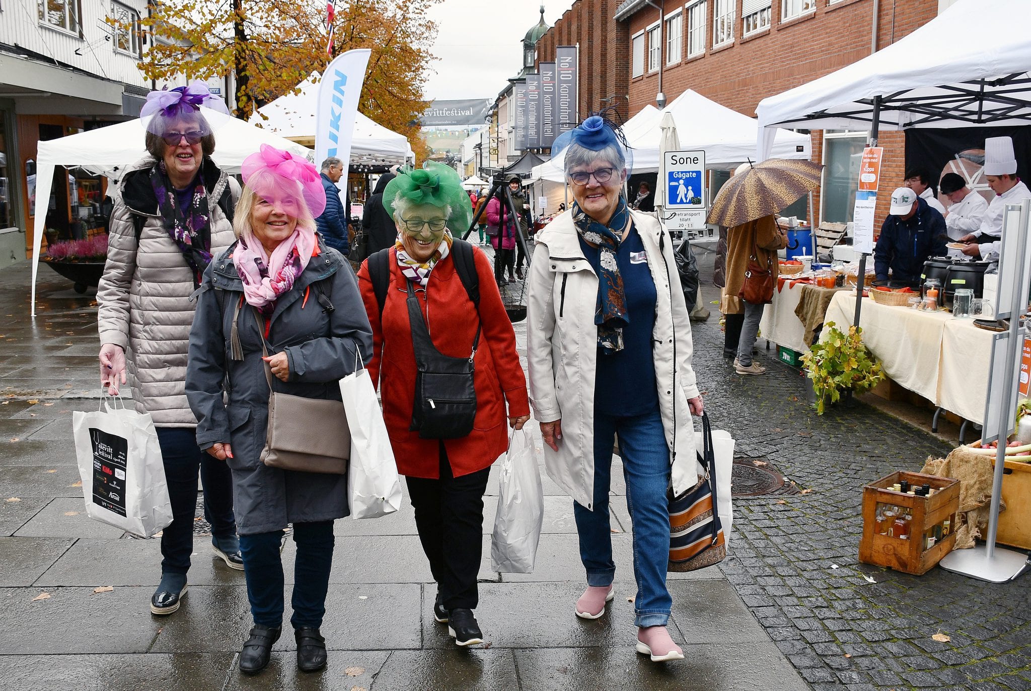 Nå er festivalstemningen på gang! En fargerik damekvartett fra Dokka satte ekstra farge på akevittfestivalen fredag.