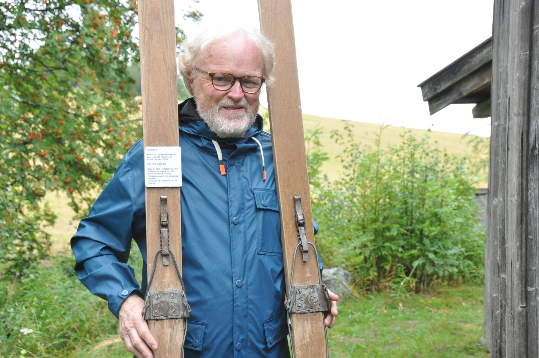 – Dette er stas. Dette er virkelig skihistorie, sier Viggo Sandvik og tar en kikk på hoppskiene som Olaf Hoffsbakken brukte da han vant VM i kombinert i 1938.
