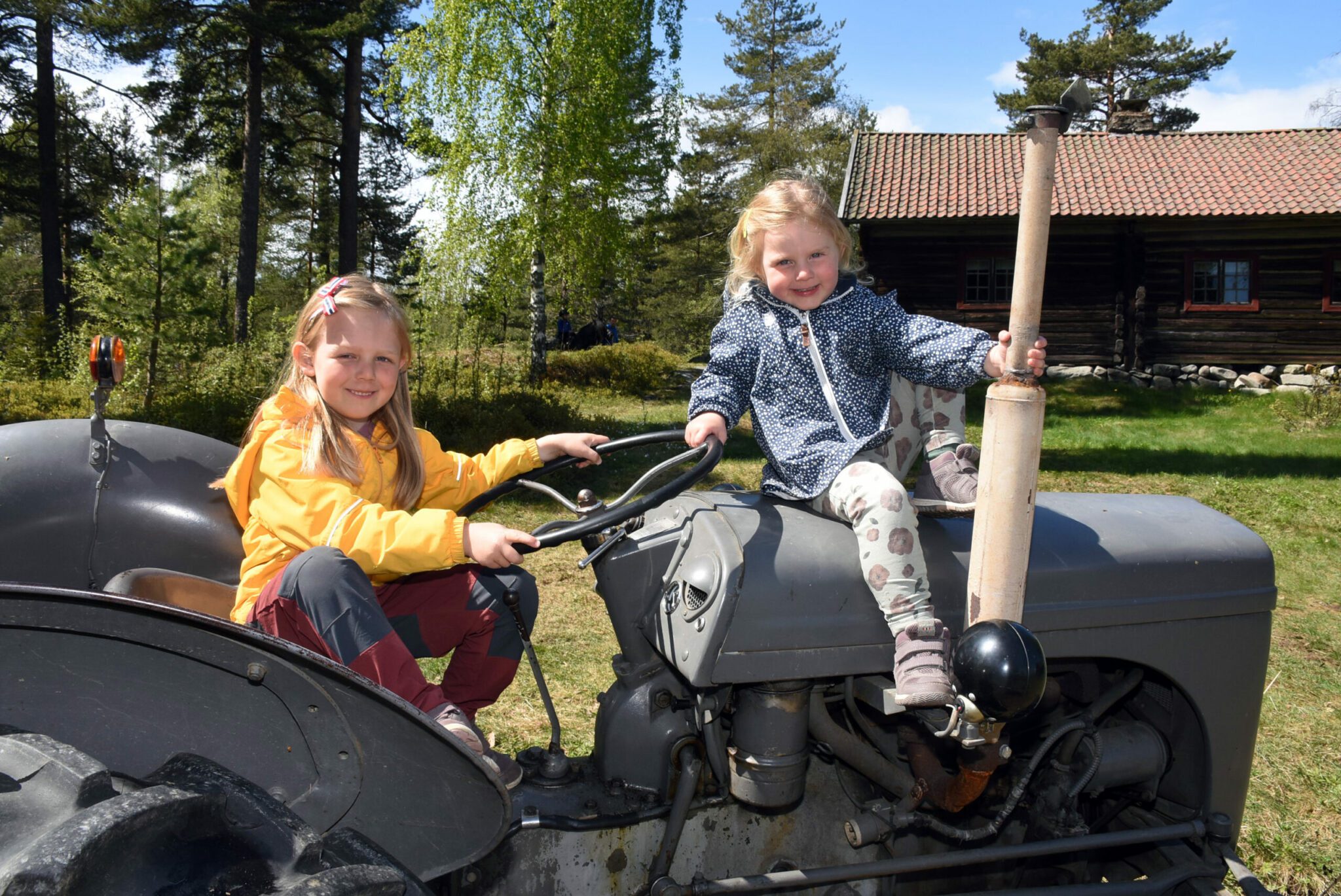 Ylva og søsteren Elvira (5) var blant de mange traktorinteresserte som hilste på traktoren fra 50-tallet søndag. De som foretrakk andre slags hestekrefter, kunne sette seg på en dølahest rett i nabolaget.