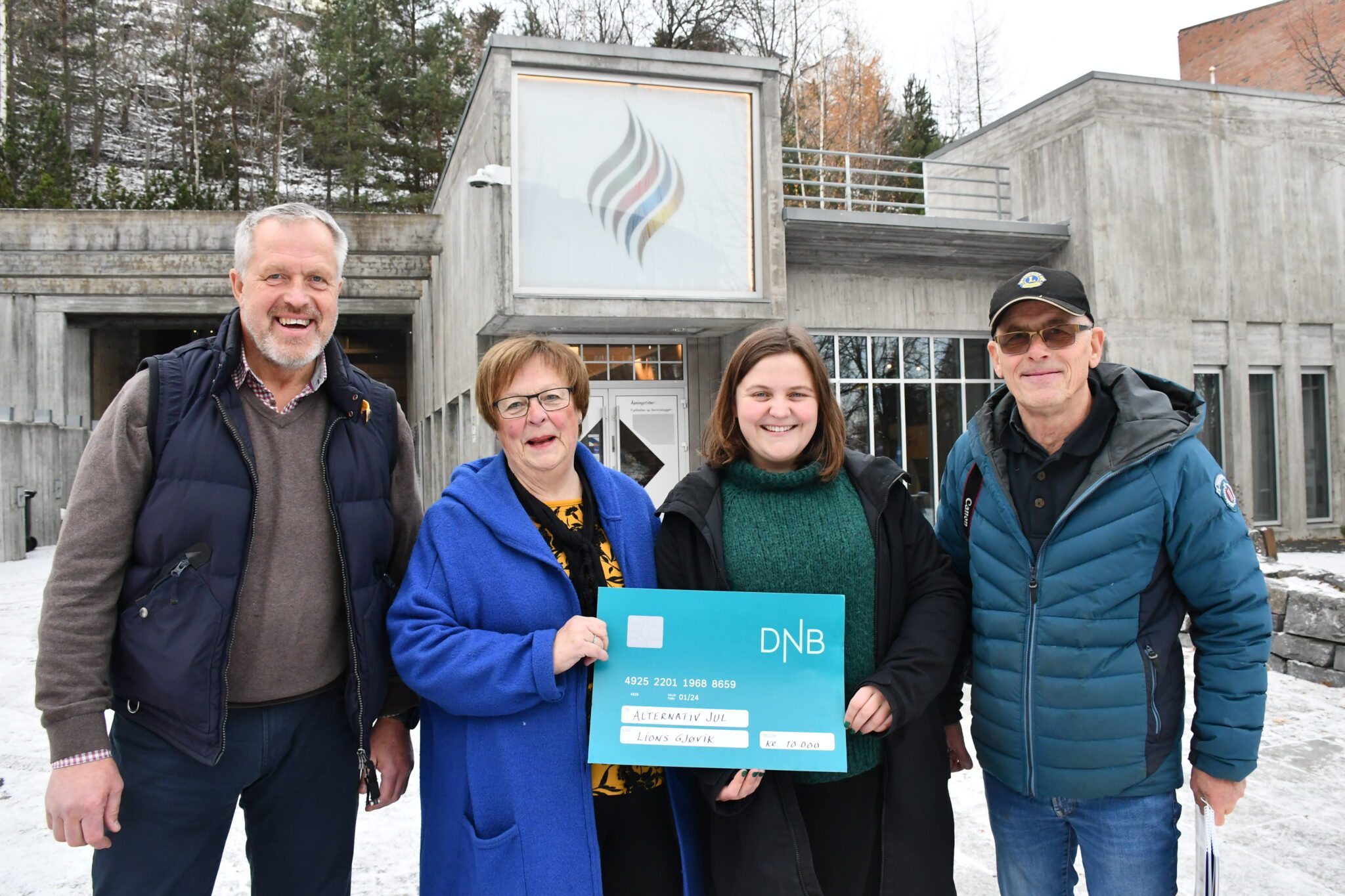 Det var stor glede hos Kampen Blå Kors da Lions Club Gjøvik kom med en gavesjekk på 10.000 kroner. Prosjektleder for Alternativ Jul i Fjellhallen, Frøydis Holstad Torp, fikk også en sjekk pålydende 10.000 kroner.