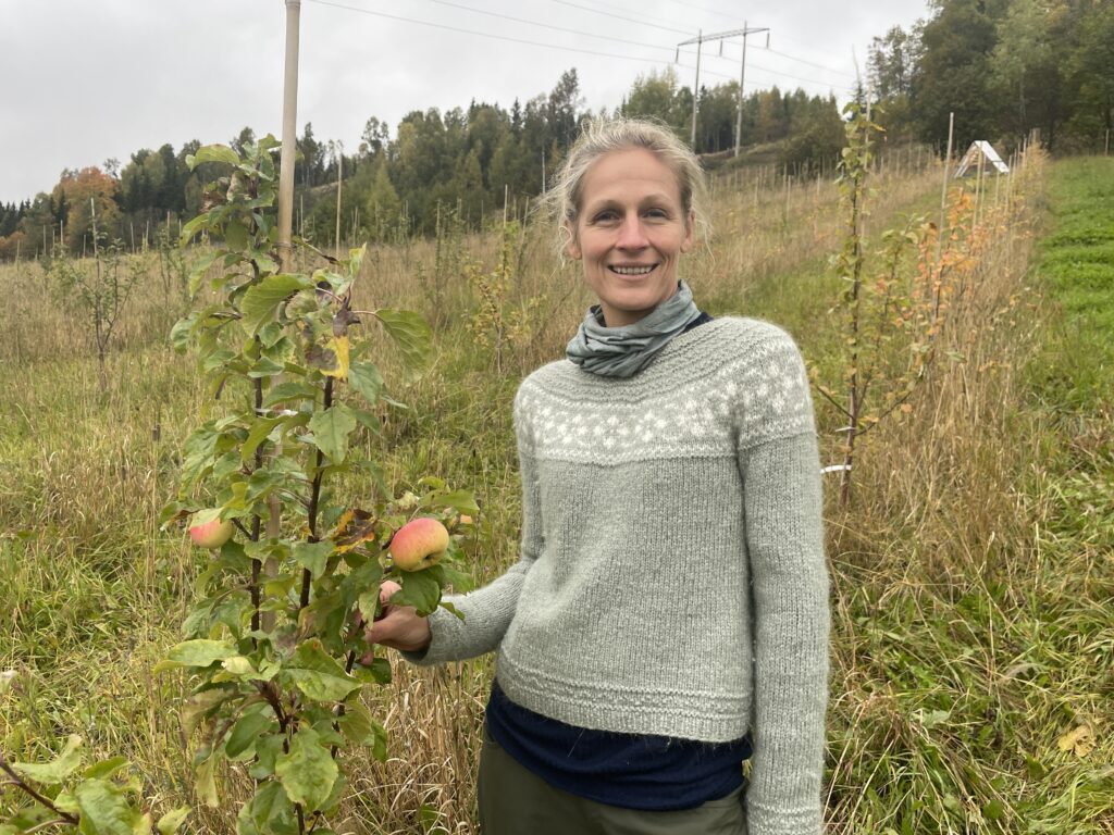 – Vi har plantet 1.300 epletrær av forskjellige sorter. De fleste er gamle nordeuropeiske sorter, sier Karin og viser oss epletrær som er plantet på rekke og rad i sydhellinga.